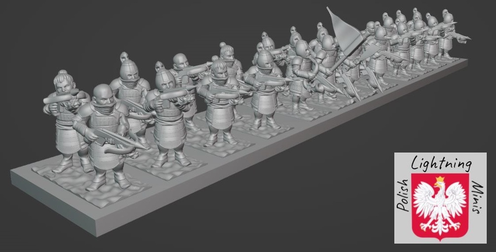 You get .stl files for a full unit of Eastern Dynasty troops designed for 10mm scale battles.